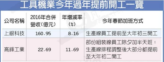 一例一休墊高生產成本,今年農歷春節假期又比去年少,工具機業過年加班趕工盛況不再,僅上銀集團、高鋒等少數廠商需要提前開工。上銀集團首季訂單滿載,直線導軌及機器人生產線人員提前至大年初三趕工;高鋒部份組裝生產線人員除夕要上半天班,且多提前至初二開工。
