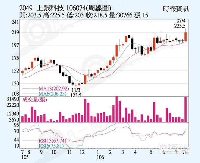因今年工具機產業(yè)景氣好轉、大陸對自動化設備及機器人需求持續(xù)增溫,上銀年底前訂單滿載,全年合并營收有機會續(xù)創(chuàng)歷史新高,上周五自營商雖賣出,承接買盤強勁,呈價穩(wěn)量縮走勢,上漲1.5元而以218.5元作收,創(chuàng)2015年7月以來新高,周漲幅7.37%。