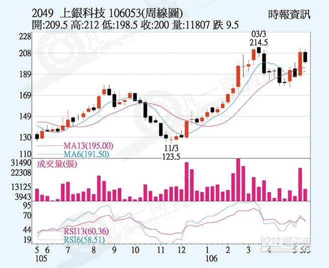 上銀科技(2049)三大主力產品年底前訂單滿載,日系外資首次對臺灣工業用機器人族群出具報告,給予上銀持有評等,但目標價為205元,三大法人上周五買超309張,然終場下跌3.5元,以200.0元收盤,跌破5日均線,周跌幅為4.53%。