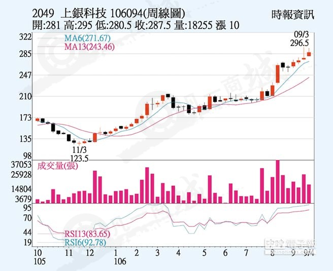 上銀科技(hiwin)受惠直線導軌及滾珠螺桿等關鍵零組件訂單滿手至明年底,加上德國漢諾威展接單增3~5成等利多題材,外資等法人連續買超,近三個月股價大漲近4成后,出現整理格局,上周五下跌5元收在287.5元,法人估在原料缺貨追單題材下,行情仍有望追高。