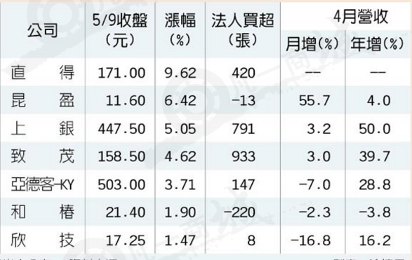 智慧機械題材再度熱炒,搭上4月營收業(yè)績揭露,指標(biāo)股上銀科技、亞德客分別年增50%、28.8%,上銀創(chuàng)下歷史新高,帶動機器人概念股多頭點火,直得科技一度攻上漲停、大漲9.62%,上銀、亞德客都漲逾3%。