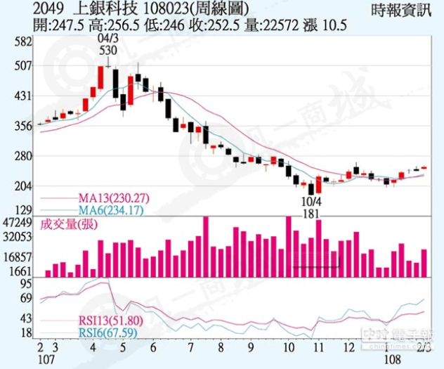 上銀科技1月合并營收16.67億元,雖出現近21個月新低,但法人樂觀自動化設備需求會從年中開始回溫,對上銀滾珠絲桿、直線導軌等傳動組件需求也增溫,外資及自營商上周五合計買超505張,帶動股價上漲5.5元、收252.5元,周漲幅4.33%,收復周、月及季線。
