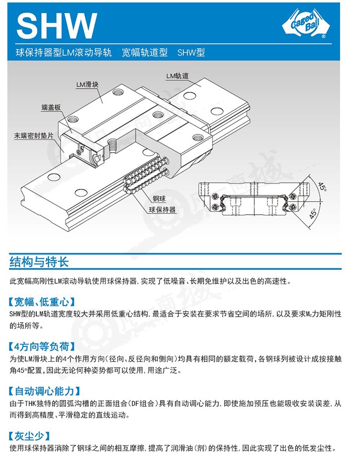 4個(gè)方向等符合:為使LM滑塊的4個(gè)作用方向(徑向,反徑向和側(cè)向)均具有相同的額定負(fù)荷,各鋼球列被設(shè)計(jì)成按接觸角45。配置,因此無(wú)論何種姿勢(shì)都可以使用,用途廣泛.